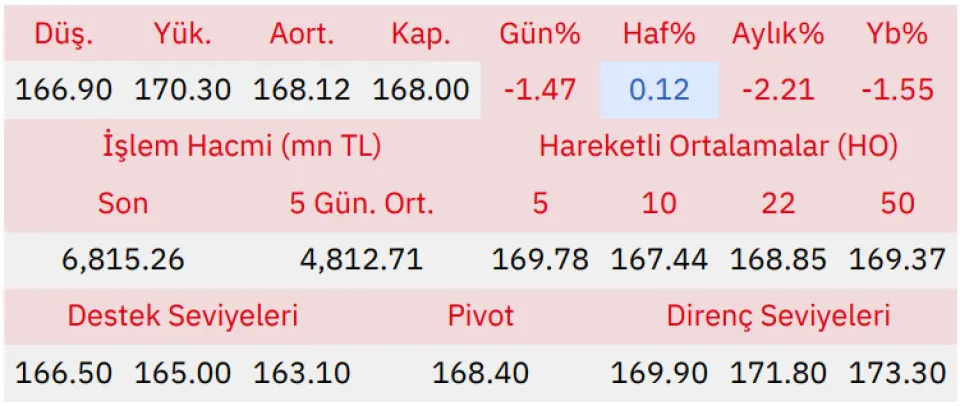 Gün içinde en düşük 166.90 en yüksek 170.30 seviyesini gören Koç Holding hissesinin günü %1.47 kayıpla tamamladığı gözlenmektedir. Pivot seviye 168.40 seviyesinden geçmekte olup, aşağı yönlü hareketlerde birinci destek 166.50, ikinci destek ise 165.00 seviyesinden geçmektedir. Dirençler ise sırasıyla 169.90, 171.80 seviyelerinden geçmektedir. Bu aşamada endeksin 5 günlük HO seviyesinin %1.05 altında, 22 günlük HO seviyesinin ise %0.50 altında hareket ettiği dikkat çekmektedir. Son gün işlem hacmi ise bu aşamada 5 günlük ortalama işlem hacminin % 41.61 üstünde gerçekleşmiştir.