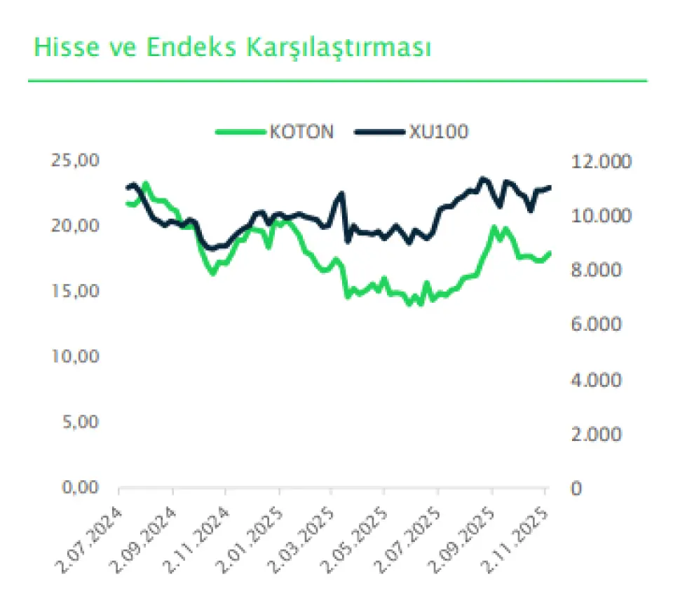 Koton, zorlu makroekonomik koşullar, güçlü TL politikası ve olumsuz jeopolitik etkilere rağmen 9A 2025 döneminde enflasyon muhasebesi hariç yıllık bazda %35 oranında konsolide satış büyümesi kaydetmiştir. 2025’in üçüncü çeyreğinde ise bu aran %32’dir. Enflasyon muhasebesi dahil edildiğinde ise konsolide satışlarda yıllık %3,9 daralma görülmüştür. Yurt içinde, zayıflayan tüketici talebine rağmen mağazacılık satışları performansı ile yurt içi satışlar reel bazda %5 seviyesinde büyümüştür. Bu büyüme, kârlılık odaklı stratejik kararlar doğrultusunda daraltılan e-ticaret ve toptan kanallarının etkisini dengelemiştir. Mağazacılık kanalında operasyonel hızlanmanın da etkisiyle yurt içi satışlar yıllık bazda %5,1 büyüme göstermiştir. Yurt içi LFL (Like-for-Like) mağazacılık satış adedindeki %12,0'lik güçlü artış, şirketin metrekare verimliliğindeki (USD bazında %23,8 artış) başarısını desteklemektedir. 4Ç 2025 için şirket, satış büyümesini "Yatay – Kısmi daralma" olarak beklemektedir.