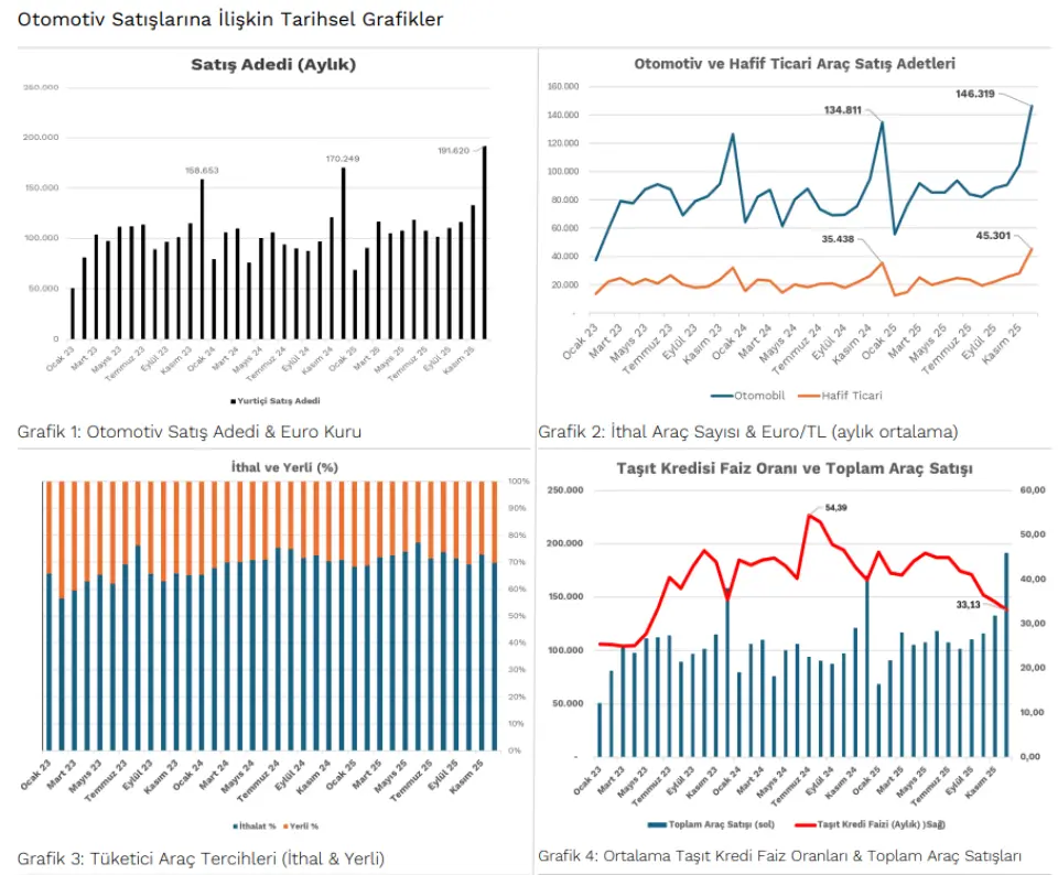 Otomobil ve hafif ticari araçlar Aralık ayında toplam 191.620 araç satışı gerçekleştirilerek geçen yılın Aralık ayına göre %12,55 artış gösterdi. Bu dönemde otomobil satışı %8,54 artarak 146.319 adet olurken hafif ticari araç pazarı ise %27,83 artışla 45.301 oldu. Açıklanan Aralık ayı rakamları son 3 yıllık ortalamasının %10,4 üzerinde gerçekleşti.