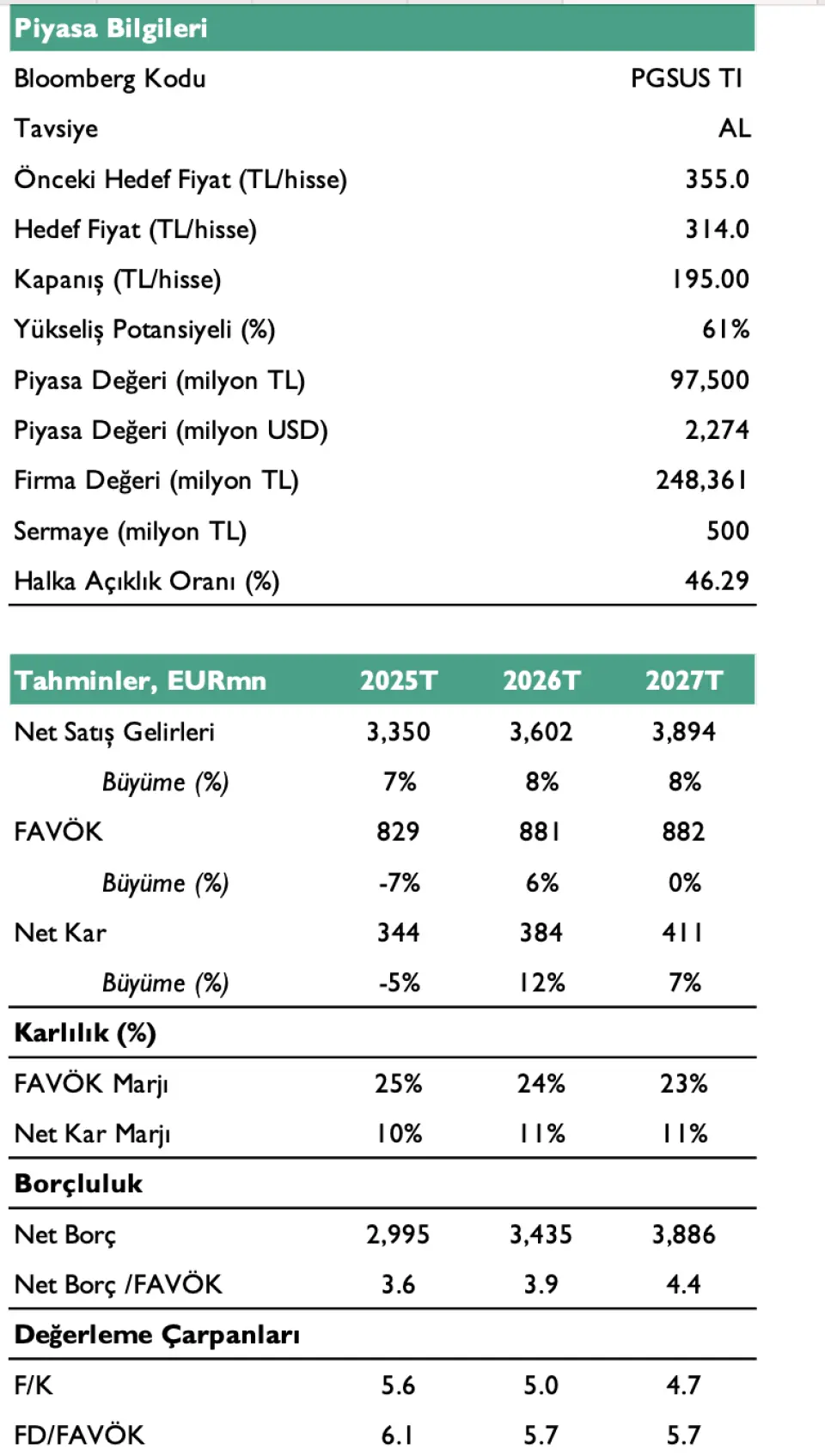 - "Pegasus’un 2025 yılını dolar bazında %7 net satış geliri büyümesi ile 3.350 milyon euro ve %24,7 FAVÖK marjı ile tamamlamasını öngörüyoruz. Büyümenin önümüzde dönemde sürmesini beklemekle birlikte yakıt dışı maliyetlerdeki görünümün marj ve karlılık açısından belirleyici olmasını bekliyoruz. Bu çerçevede 2026 yılını 3.602 milyon euro net satış geliri ve %24,5 FAVÖK marjı ile tamamlamasını tahmin ediyoruz. Yeni makro tahminlerimizin güncellenmesi, modelimizi 1 yıl ileri taşımamız ve çarpan güncellemesi sonrasında 12 ay ileri hedef fiyatımızı 355 TL’den 314 TL’ye revize ediyoruz. Şirket, 2026 tahminlerimize göre 5,7x FD/FAVÖK çarpanı ile işlem görmektedir."