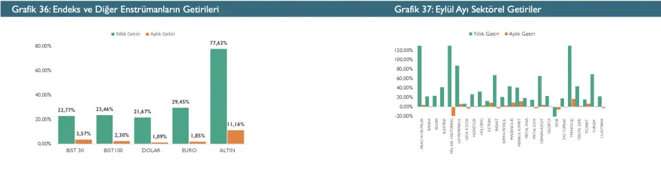 - "BIST 100 endeksinde tarihi zirve seviyelerine yakın bir fiyatlamadan sonra düzeltme hareketlerinin görüldüğü bir ay geride kaldı. Haziran'da başlayan ve süregelen birkaç aylık periyotta momentum kazanımı etkisine devam etti. Ağustos'ta yeni tarihi zirveler gündeme gelirken Eylül'ün başlangıcında da bu seviyelere yakın fiyatlamalar görüldü. Eylül ayında yurt içinde yaşanan gelişmelere ilaveten Cumhurbaşkanı Erdoğan – Donald Trump görüşmeleri ana başlıklar arasında yer aldı. Erdoğan – Trump görüşmesinden piyasanın beklentilerini karşılayamadığı algısı fiyatlamalar üzerinde etkisine devam etti. Ayrıca, TÜİK verilerine göre Eylül 2025’te tüketici fiyat endeksi (TÜFE) aylık %3,23 artışla yıllık bazda %33,29 olarak gerçekleşti. Böylece yıllık enflasyon, 16 ay aradan sonra ilk kez artış kaydetti. Kuveyt Türk Yatırım Araştırma %2,48 ve konsensüs beklentileri aylık TÜFE’nin %2,50 artması yönündeydi. Enflasyon’un hem bizim hem de konsensüs beklentilerinin üzerinde gerçekleşmesi sonucu Merkez Bankası'nın temkinli adım atacağını öngörüyoruz. Piyasanın genel öngörüsünün de bu yönde olması sonucu BIST 100 endeksinde sert geri çekilmeler gündeme geldi. Ancak, sert geri çekilmelere karşın BIST 100 endeksi Eylül ayını %2,30’luk artışla tamamladı."
