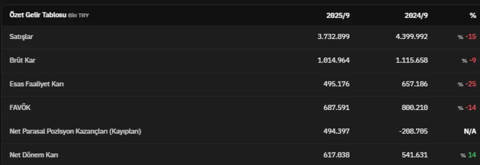 FAVÖK 2025 yılının üçüncü çeyreğinde 687.591.000 TL olarak açıklandı. Net parasal pozisyon kazançları 2025 yılının üçüncü çeyreğinde 494.397.000 TL olarak kaydedildi. Net dönem kârı ise 617.038.000 TL olarak kaydedildi. İlgili veri 2024 yılının üçüncü çeyreğinde 541.631.000 TL olarak açıklanmıştı. Böylece net dönem karı %14 artmış oldu.