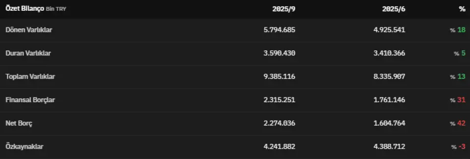 Dönen varlıklar 2025 yılının üçüncü çeyreğinde 5.794.685.000 TL olmuştur. 2025 yılının üçüncü çeyreğinde 3.590.430.000 TL olarak açıklanan duran varlıklar, 2025 yılının ikinci çeyreğinde 3.410.366.000 TL olarak açıklanmıştı. Toplam varlıklar üçüncü çeyrekte 9.385.116.000 TL olarak kaydedildi. 2025 yılının ikinci çeyreğinde 8.335.907.000 TL olan toplam varlıklar, 2025 yılının üçüncü çeyreğinde %13 artmış oldu. Finansal borçlar 2025 yılının üçüncü çeyreğinde 2.315.251.000 TL olarak kaydedildi.