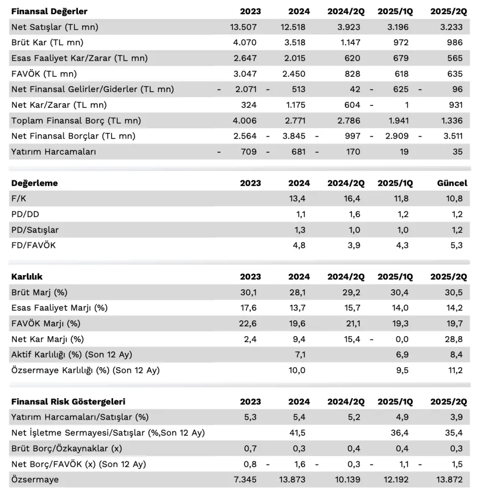 - "Şirketin 2025 senesine ilişkin beklentilerinde ticaret belirsizliklerinden dolayı gelişmiş pazarlarda kısmi daralma öngörse de yurtiçinde büyüme ile toplam satış hacminde değişim beklemiyor. Selüloz fiyatlarındaki değişimi ürün fiyatlarına yansıtabildiklerinden dolayı marjlarda sınırlı dalgalanma görülüyor. Öte yandan Lila Kağıt'ın yüksek depolama kapasitesine sahip olması da ürün fiyatlarında oluşabilecek değişimlere karşı uzun dönemlik ihtiyaçlarını stoklama kabiliyetini beraberinde getiriyor. Brüt marjın %29’un üzerinde ve FAVÖK marjının ise %20’nin üzerinde olmasını bekleyen şirket yılın ikinci yarısında ilk yarısına göre özellikle FAVÖK marjında iyileşme öngörmektedir. Şirket son 12 aylık verilerine göre 5,3x FD/FAVOK, 10,8x F/K ve 1,2x PD/DD çarpanları ile işlem görürken, yurtdışı benzer şirketlerin medyan çarpanları 13,5x F/K, 7,1x FD/FAVÖK ve 0,95x PD/DD seviyelerinde bulunmaktadır."