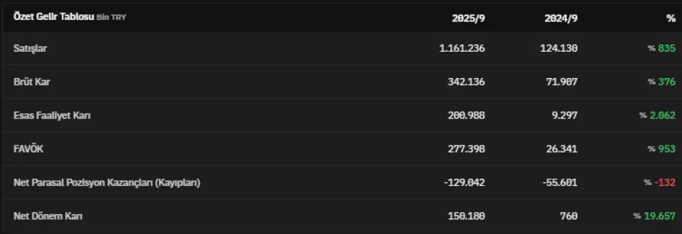 FAVÖK 2025 yılının üçüncü çeyreğinde 277.398.000 TL olarak açıklandı. Net parasal pozisyon kazançları 2025 yılının üçüncü çeyreğinde -129.042.000 TL olarak kaydedildi. Net dönem kârı ise 150.180.000 TL olarak kaydedildi. İlgili veri 2024 yılının üçüncü çeyreğinde 760.000 TL olarak açıklanmıştı. Böylece net dönem karı %19.657 artmış oldu.