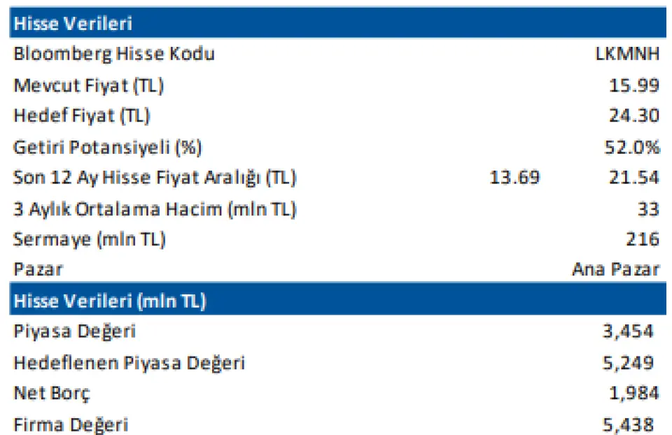 Deniz Yatırım şirketin finansal rakalarını değerlendirdi ve hisseye 24,30 TL hedef fiyat verdi. LKMNH 16TL civarı fiyatlardan işlem görüyor.