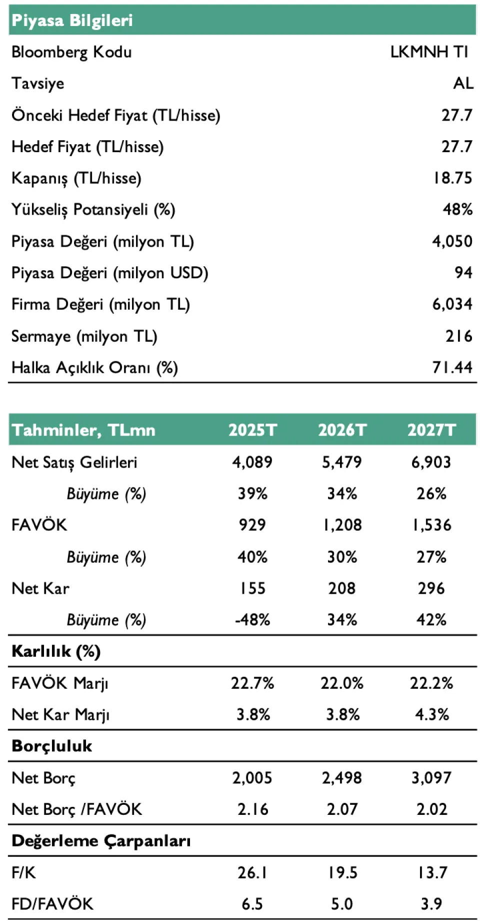 Kuveyt Türk Yatırım, LKMNH hissesi için hedef fiyatını 27,7 TL olarak açıkladı. LKMNH hisse tavsiyesi de AL şeklinde sunuldu. LKMNH hissesinin yükseliş potansiyeli de %48 oldu.