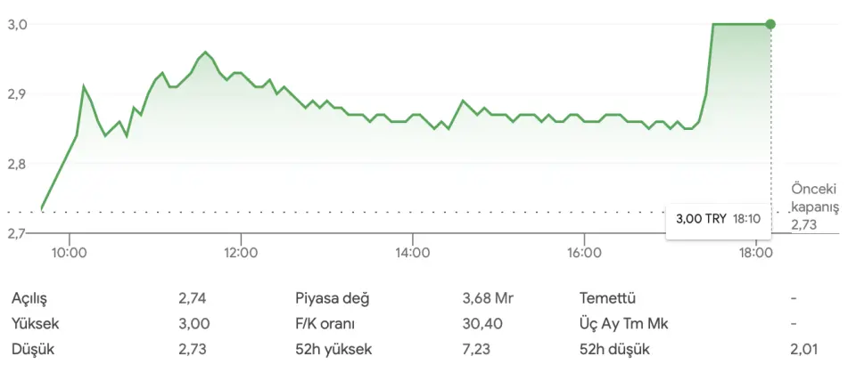 2,84 TL ile yeni işlem gününe başlayan USAK, gün içindeki hareketliliğinden sonra saat 17.30'da 3 TL'yi gördü ve günü TAVAN bitirdi. Böylece hisse 1 günde %9,89 değer kazanmış oldu.