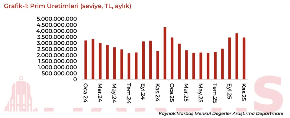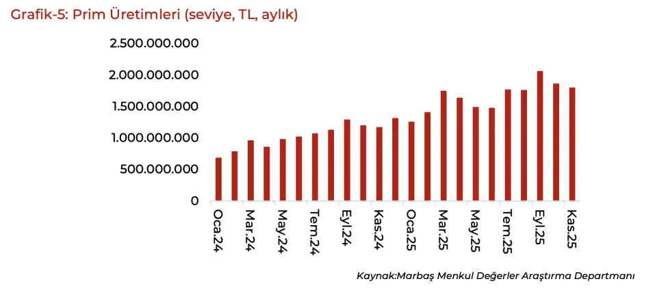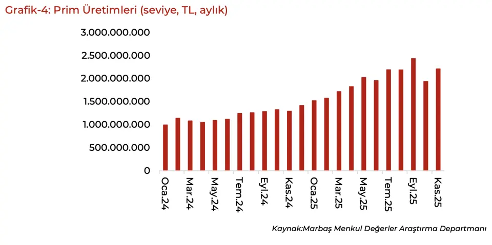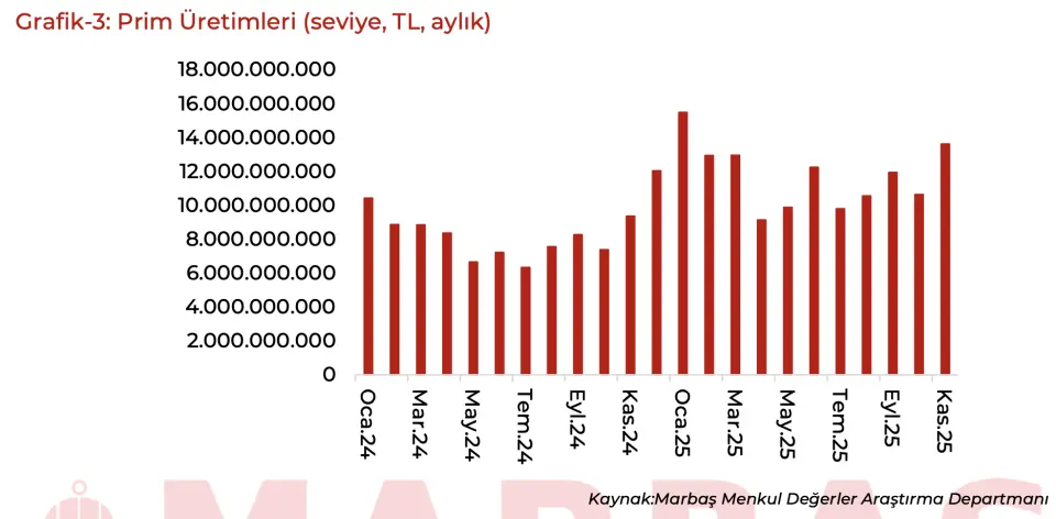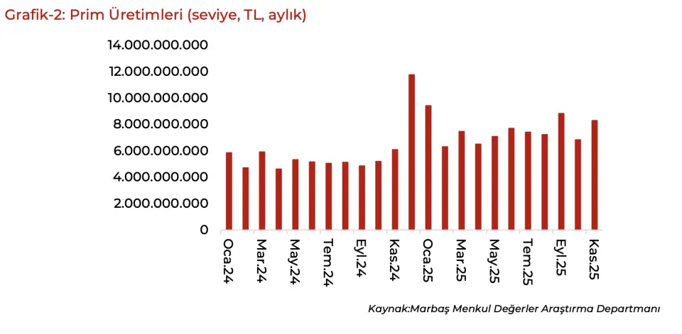 - "TURSG muhasebesel faktörlerin gecikmeli yansımalarını izliyoruz. Normalinde harcamalar kalemiyle birlikte Ekim ayında beklenen ivmelenme Kasım ayına yansıdı. Kasım ayında 13,6 milyar TL prim üretimi gerçekleştirilse de trend eğiliminde beklenen iştah gözükmüyor. 1.çeyreği aşamayan ancak son 3 çeyreğin en iyi prim üretimi olacağını tahmin ediyoruz. Karlılık tarafında da iştahın devam ettiği yapıyı takip etmeyi sürdüreceğiz."