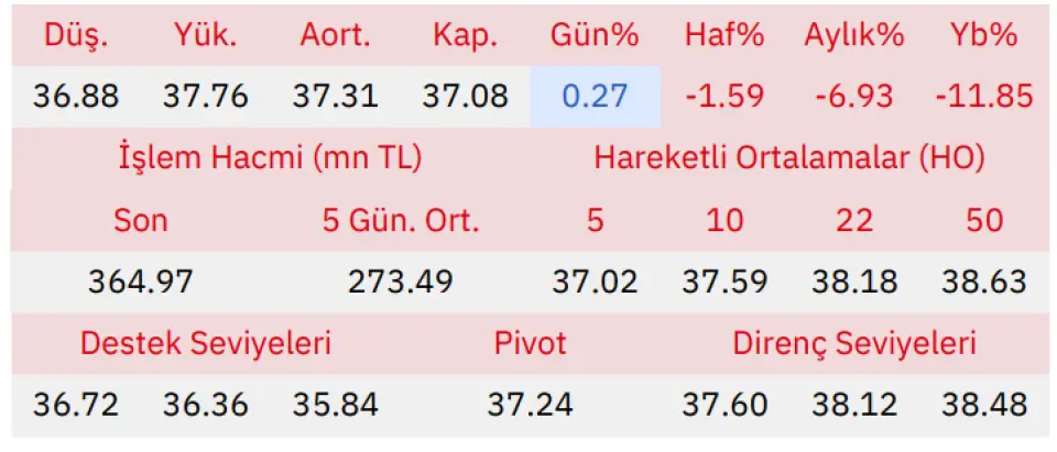 Gün içinde en düşük 36.88 en yüksek 37.76 seviyesini gören Mavi Giyim hissesinin günü %0.27 kazançla tamamladığı gözlenmektedir. Pivot seviye 37.24 seviyesinden geçmekte olup, aşağı yönlü hareketlerde birinci destek 36.72, ikinci destek ise 36.36 seviyesinden geçmektedir. Dirençler ise sırasıyla 37.60, 38.12 seviyelerinden geçmektedir. Bu aşamada endeksin 5 günlük HO seviyesinin %0.16 üstünde, 22 günlük HO seviyesinin ise %2.88 altında hareket ettiği dikkat çekmektedir. Son gün işlem hacmi ise bu aşamada 5 günlük ortalama işlem hacminin % 33.45 üstünde gerçekleşmiştir.