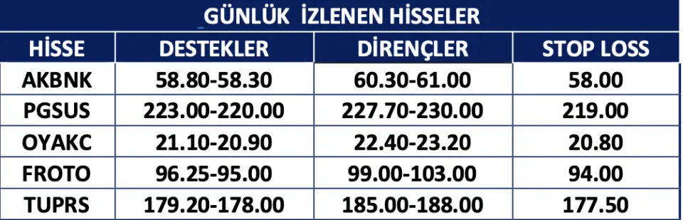 Meksa Yatırım günün izlenecek hisse senetlerini yatırımcıları ile paylaştı. Bu hisseler AKBNK, PGSUS, OYAKC, FROTO ve TUPRS oldu. Hisseler için destek, direnç ve stop loss değerleri de yayımlandı. Hisseler gün boyunca takipte olacak.