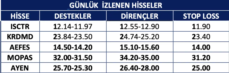Meksa Yatırım günlük izlenecek hisseler listesinde 5 hisseyi paylaştı. Bu hisseler; ISCTR, KRDMD, AEFES, MOPAS ve AYEN oldu. Hisseler için destekler, dirençler ve stop loss seviyeleri paylaşıldı.