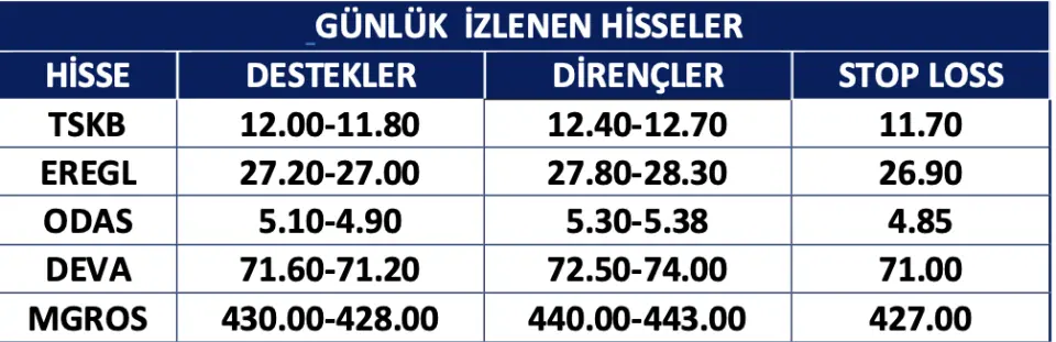 Meksa Yatırım günlük izlenecek hisse listesinde 5 hisseyi paylaştı. Meksa Yatırım'ın listesinde TSKB, EREGL, ODAS, DEVA ve MGROS'a yer aldı. Hisselere ait destekler, dirençler ve stop-loss değerlerini paylaştı.