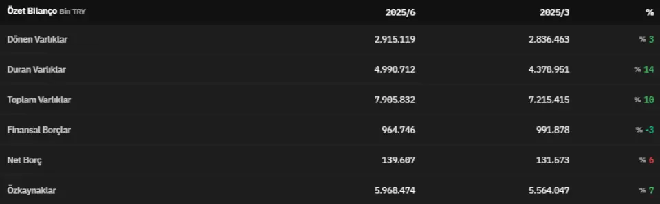 Dönen varlıklar 2025 yılının ikinci çeyreğinde 2.915.119.000 TL olmuştur. 2025 yılının ikinci çeyreğinde 4.990.712.000 TL olarak açıklanan duran varlıklar, 2025 yılının ilk çeyreğinde 4.378.951.000 TL olarak açıklanmıştı. Toplam varlıklar 2025 yılının ikinci çeyreğinde 7.905.832.000 TL olarak açıklanmıştır. 2025 yılının ilk çeyreğinde 7.215.415.000 TL olarak açıklanan toplam varlıklar, 2025 yılının ikinci çeyreğinde %10 artmış oldu.Finansal borçlar 2025 yılının ikinci çeyreğinde 964.746.000 TL olarak açıklandı. 2025 yılının ikinci çeyreğinde net borç 139.607.000 TL olarak açıklandı. Özkaynaklar 2025 yılının ikinci çeyreğinde 5.968.474.000 TL olarak duyurulmuştur.