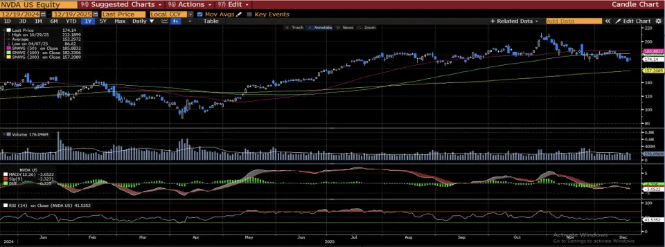 NVIDIA Corporation (NVDA) hissesi, 18 Aralık 2025 itibariyle 174,14 $ seviyesinde işlem görmekte ve son günlerde %1,9 oranında bir artış kaydetti. Hisse, 50 günlük hareketli ortalamanın altında olsa da 200 günlük hareketli ortalamanın üzerinde kalmaya devam ederek, uzun vadeli yükseliş eğilimini sürdürüyor. Teknik göstergeler, fiyatın aşırı satım bölgesine girmediğini ve kısa vadeli momentumun sağlıklı olduğunu işaret ediyor.
