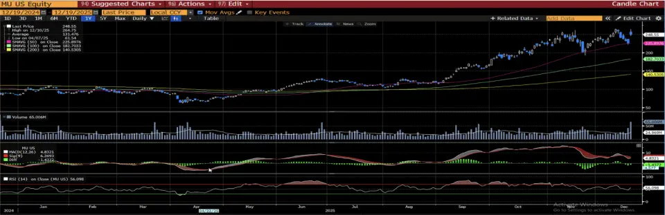 Dün, Micron Technology (MU) hissesi, 225,52 $'dan 248,55 $'a yükselerek %10,2 değer kazandı. Bu güçlü artış, şirketin AI talebinin artması ve veri merkezi bellek çiplerine olan yüksek talebin etkisiyle gerçekleşti. Hisse, 50, 100 ve 200 günlük hareketli ortalamaların üzerinde işlem görmeye devam ediyor; bu, hisse için kısa ve orta vadeli yükseliş trendinin sürdüğünü gösteriyor. Teknik göstergeler de fiyatın aşırı alım veya aşırı satım bölgelerinde olmadığını ve genel olarak sağlıklı bir momentum olduğunu işaret ediyor.