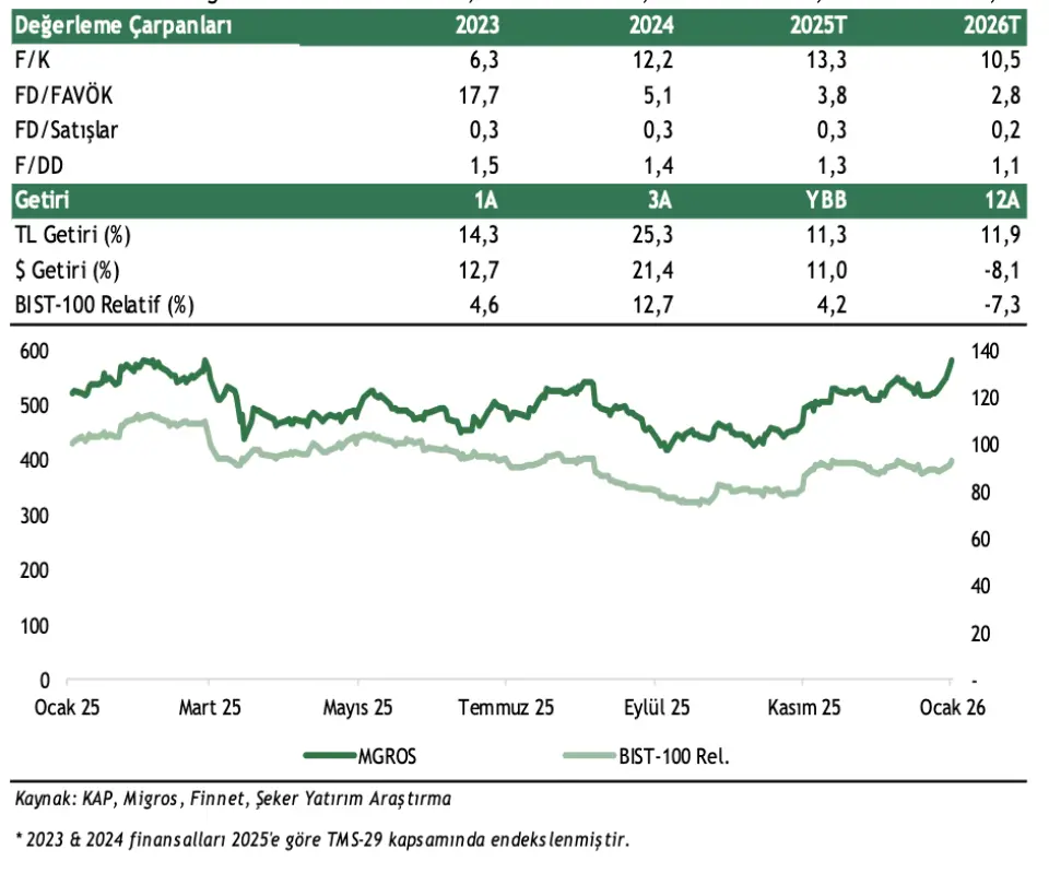 - "Yüksek enflasyon ve yoğun rekabet ortamına rağmen çoklu kanallarda büyüme stratejisiyle Migros’un FMCG pazar payını istikrarlı şekilde artırılabilmesini olumlu değerlendiriyoruz. Artan mağaza sayısı ve buna bağlı satış alanı büyümesi ile e-ticaret kanallarının net satışlara sağladığı pozitif katkının, 2026’da da destekleyici olacağını düşünüyoruz."