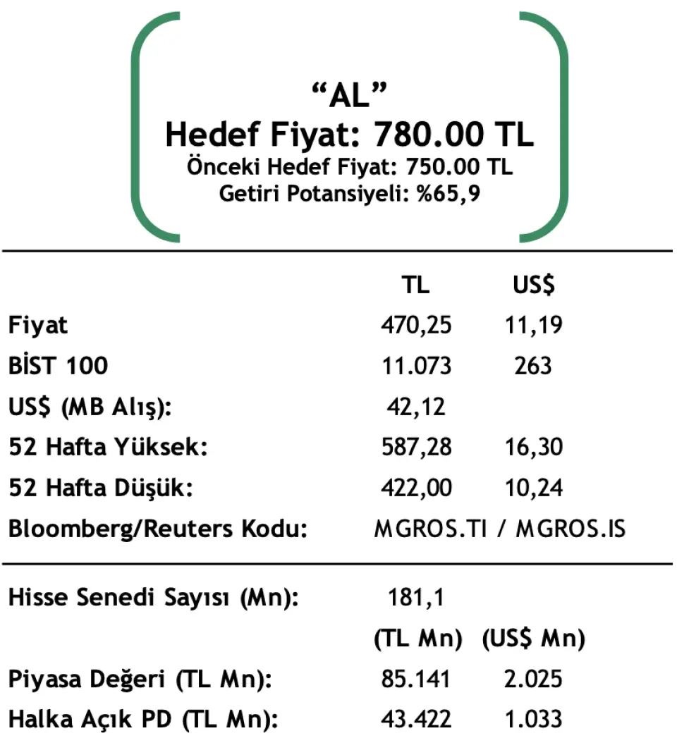 2025 Beklentileri: Migros 2025’te TMS-29 dahil %6-%7’lik (Önceki: %8-%10) reel satış büyümesi, %6,5 (Önceki: ~%6,0) FAVÖK marjı beklemektedir. Migros’un 2025 sonu mağaza açma hedefi ~250 mağaza, yatırım harcaması/satışlar beklentisi %2,5-%3,0 aralığındadır.