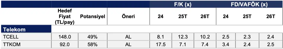 - "Ayrıca spektrum ve imtiyaz yenileme maliyetlerinin hem Turkcell hem de Türk Telekom açısından agresif rekabeti doğal olarak sınırlayarak 2026 boyunca daha sağlıklı bir piyasa dinamiğini desteklemesini bekliyoruz. Bu çerçevede değerlendirdiğimizde Telekom sektöründe en beğendiğimiz hisse Turkcell’dir. <TCELL TI> birden fazla iş kolunda faaliyet göstererek tüketici talebini karşılamaya çalışması nedeniyle Turkcell’i top pick olarak değerlendiriyoruz. Türk Telekom tarafında ise <TTKOM TI> önümüzdeki dönemde yüksek kapasite harcamalar ile nakit akışı çok zorlanacaktır. Bu yüzden çekimser görüşümüzü koruyoruz."