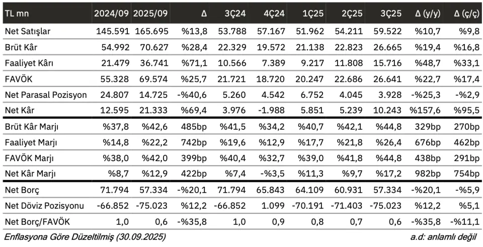 - "Yakın zamandak relatif zayıf performansından sonra mevcut seviyeleri sağlıklı bir konsolidasyon sonrası yeniden alım fırsatı olarak değerlendiriyoruz ve orta-uzun vadede yapısal büyüme dinamiklerinin güçlü kaldığını düşünüyoruz. Net borç çeyreklik olarak ~TL57bn seviyesinde yatay kaldı; yönetimin düzeltilmiş tanımına göre Net Borç/FAVÖK 0.61x’e geriledi (2Ç25: 0.68x). Yönetim, 2025 FAVÖK marjı beklentisini 50bp yükselterek %41.5 olarak güncelledi. Sonuçları pozitif olarak yorumluyoruz."