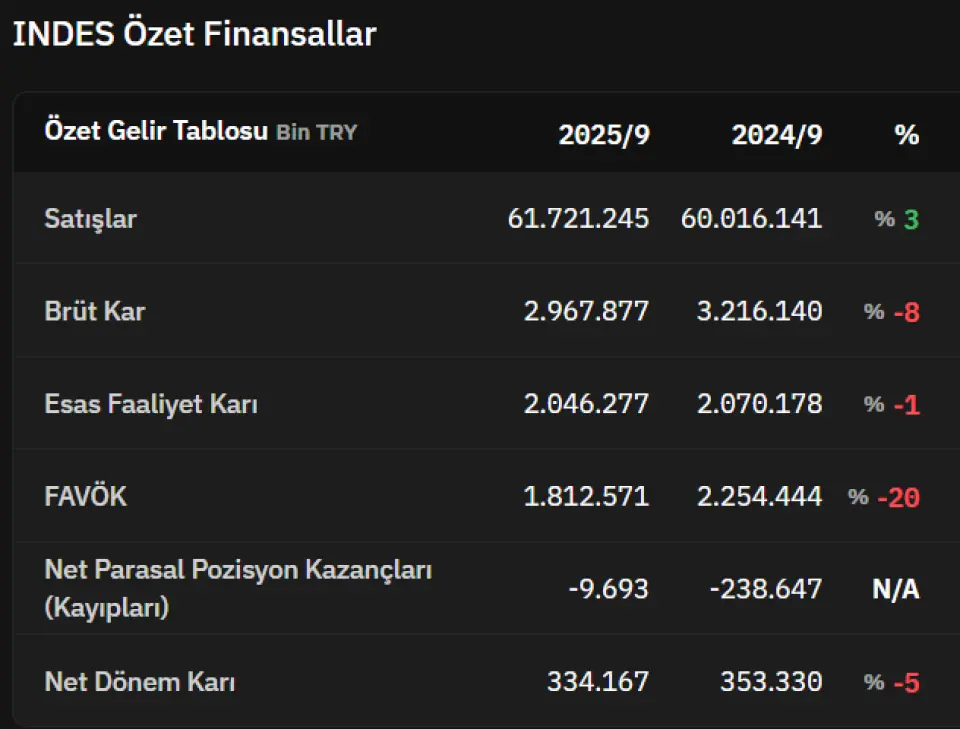 INDES bu yıl 3. çeyrek bilançosuyla, geçen yılın aynı dönemiyle neredeyse aynı kar rakamını açıkladı. Şirket 334.167.000 TL kar açıkladı. Bu rakam şirketin geçen yıl açıkladığı kardan sadece %5 düşük. Buna rağmen Gedik Yatırım şirketin açıkladığı kar rakamını, operasyonel baskılara rağmen net kar tarafında sağlanan iyileşme nedeniyle sınırlı pozitif olarak değerlendirdiğini açıkladı.