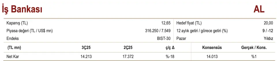 - "2025 yılı 3. çeyrekte ISCTR konsensüs öngörüye paralel 14,2 milyar TL net kar duyurdu. Net kar çeyreklik olarak %18 gerilerken, yıllık olarak %157 arttı. 3. çeyrekte net karı %15 öz sermaye karlılığına işaret ederek finansallarını paylaşan özel bankaların gerisinde kaldı. Net faiz marjındaki toparlanma benzer bankalara göre güçlü gerçekleşse de iştirak gelirlerindeki çeyreklik %33 gerileme ve karşılık giderlerindeki %47 artış net kar üzerinde baskı oluşturdu. Bankanın net karı yılın ilk 9 ayında %27 artarak %16.8 öz sermaye karlılığına işaret etti."