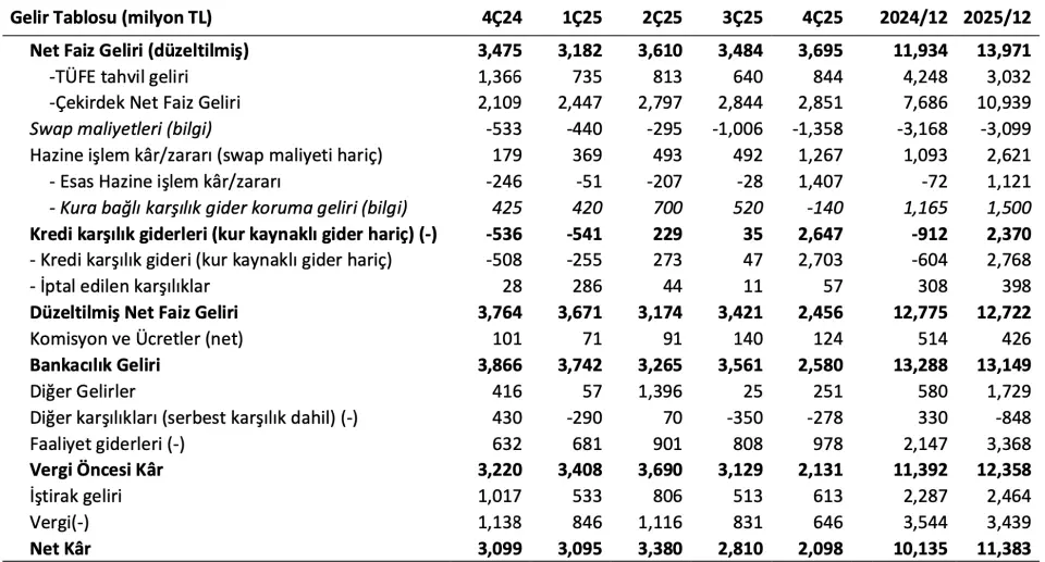 "Bankanın komisyon gelirleri 4Ç25’de %11 ve 2025’de önceki yıla göre %17 geriledi. Buna karşılık faaliyet giderlerindeki artış 4Ç25’te %21 ve 2025’te önceki yıla göre %57 düzeyinde oldu."