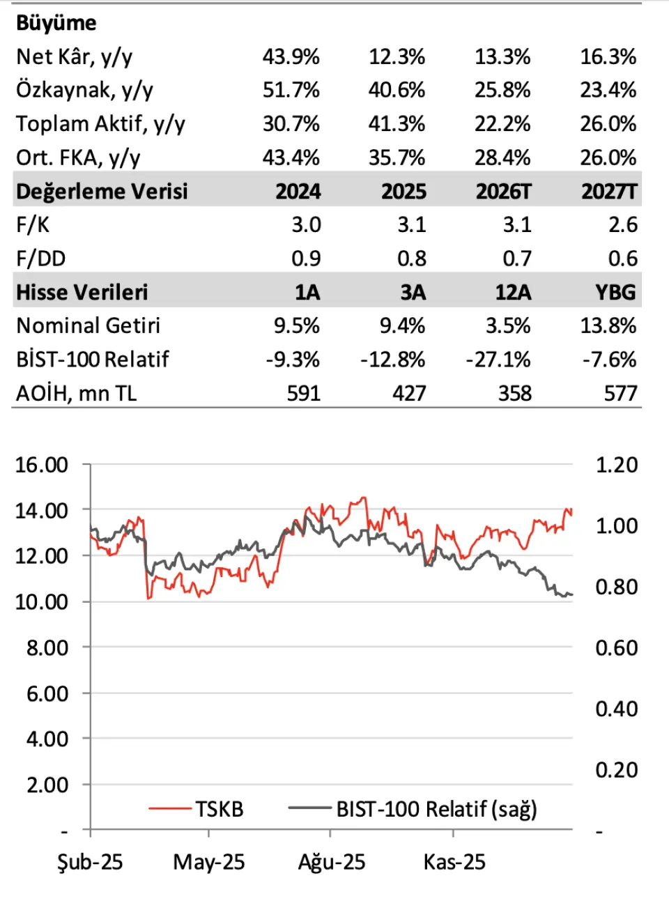- "TSKB’nin 2026’ya ilişkin öngörülerinde kredilerde dolar bazında %10 büyüme ve net faiz marjında 100 baz puanın üzerinde gerileme beklentisi dikkat çekiyor. Banka YP ağırlıklı aktif yapısı nedeniyle TL faiz indirimlerinden mevduat bankaları kadar yararlanamayacak ayrıca TÜFE tahvil getirisi de düşecek."