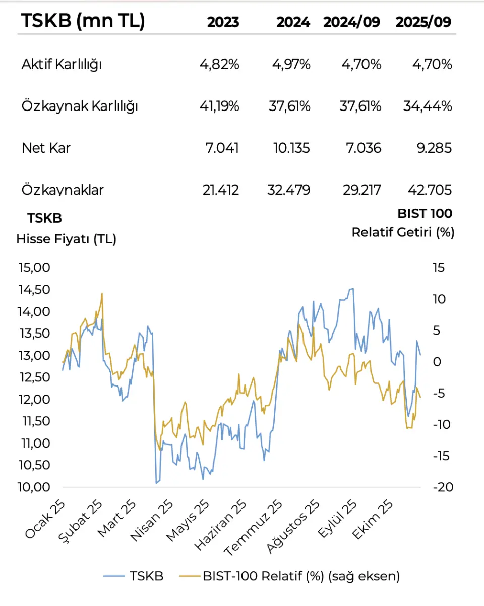 - "2025 yılı üçüncü çeyreğinde TSKB, önceki senenin aynı çeyreğine oranla %32 artış ile beklentilere paralel 2,8 milyar TL net kar duyurdu. Banka 2025 yılı 3. çeyrek itibariyle tek seferlik kalemlerden arındırılmış %31,2 (serbest karşılık etkisi arındırıldığında %35) özkaynak karlılığına ulaşırken, aktif karlılığı ise %4,7 olarak gerçekleşti. İlgili dönemde Banka, 350 mn TL tutarında serbest karşılık çevirirken, 2,46 milyar TL arındırılmış net kar elde etti. 2Ç25’te elde edilen 3,38 milyar TL’lik karın içerisindeki 1,14 milyar TL’lik tek seferlik tahsilat etkisi arındırıldığında ise %10’luk çeyreksel kar büyümesine ulaşıldı."