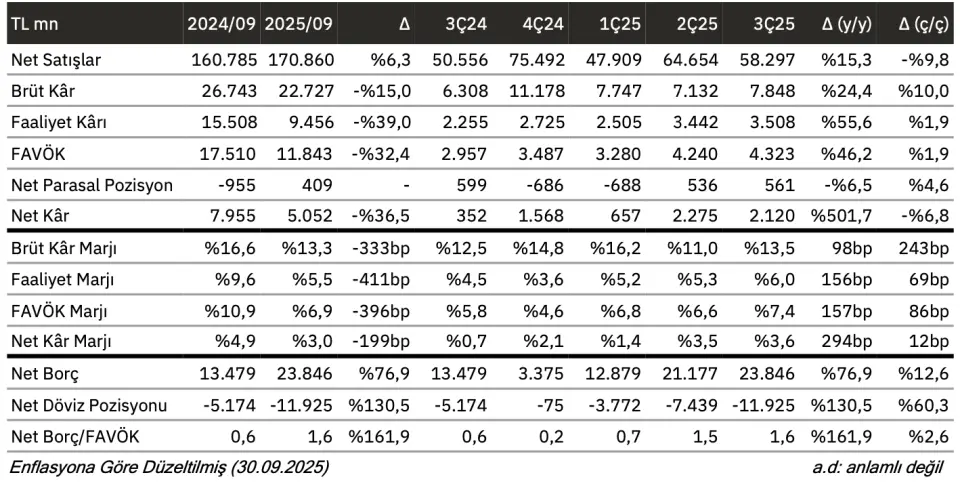 - "Net satışları 3. çeyrekte önceki senenin aynı çeyreğine oranla %15,31 artışla 58.297 milyon TL olmuştur. 2025 senesinin ilk 9 ayında net satışları %6,27 artışla 170.860 milyon TL seviyesinde gerçekleşmiştir. FAVÖK‘ü 3. çeyrekte geçen yılın aynı çeyreğine göre %46,20 artışla 4.323 milyon TL olmuştur. 2025 yılının ilk 9 ayında bir önceki yılın aynı dönemine göre FAVÖK’ü %32,36 azalışla 11.843 milyon TL seviyesinde gerçekleşmiştir."