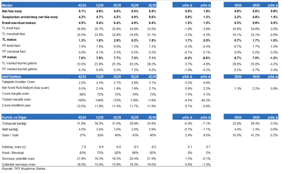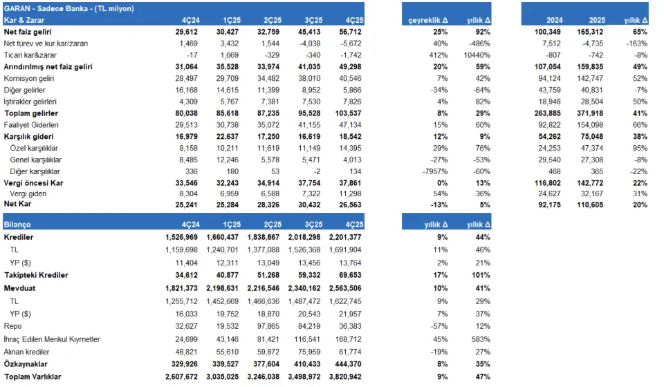 Garanti’nin net karı 4Ç25’te 26.6 milyar TL seviyesinde açıklandı (YKY beklentisi: 26.6 milyar TL idi ve piyasa beklentisi 26.2 milyar TL'ydi). Net kar dördüncü çeyrekte çeyreklik %13 geriledi ve yıllık %5 arttı. 4Ç25 özkaynak karlılığı %25 seviyesinde gerçekleşti (2025: %29). Aracı kurum, "Net faiz gelirleri beklentimizden daha olumlu gelişirken, komisyonlar ve diğer faaliyet gelirleri ise beklentimizin altında kaldı. 4.çeyrekte 80 baz puan net faiz marjı iyileşmesi gerçekleşti fakat artan karşılıklar ve vergi gideri karlılığı baskıladı." değerlendirmesinde bulundu.