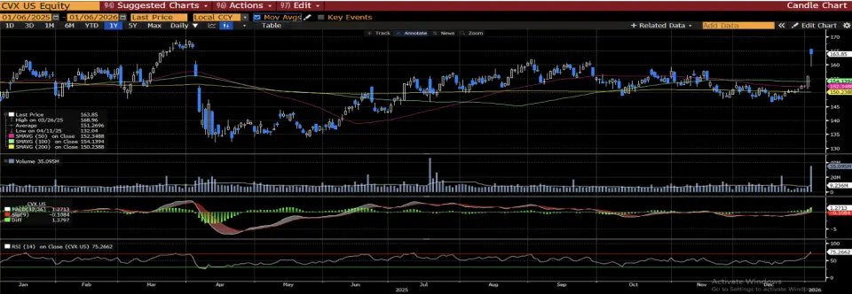Chevron Corporation (CVX) hissesi dün 163,85 dolar seviyesinden kapanarak enerji fiyatlarındaki yükseliş ve Venezuela kaynaklı gelişmelerin ABD’li petrol şirketlerine yönelik beklentileri desteklemesiyle güçlü bir performans sergiledi. Hissenin 50, 100 ve 200 günlük hareketli ortalamaların üzerinde seyretmesi yukarı yönlü trendin sürdüğüne işaret ederken, RSI göstergesinin aşırı alım bölgesine yaklaşması kısa vadede temkinli olunması gerektiğini gösteriyor.