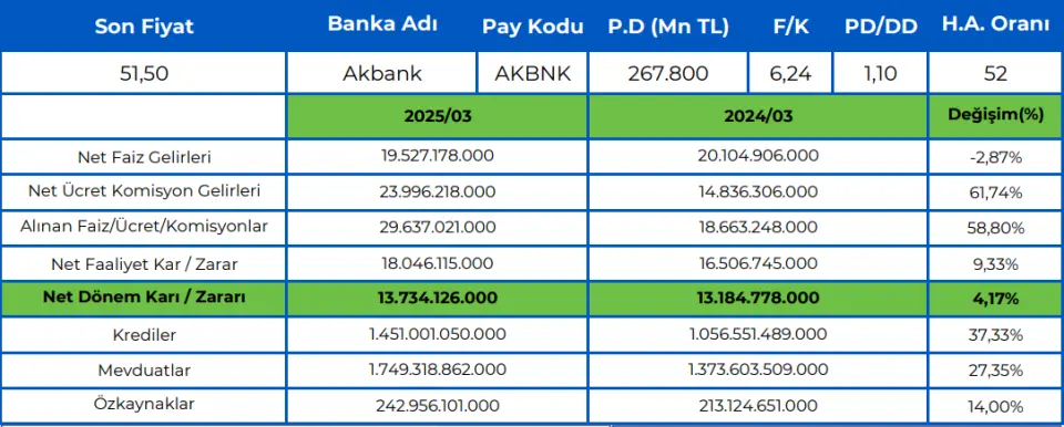 Akbank 2025 yılı ilk çeyreğinde geçen yılın aynı çeyreğine göre %4,2 artış ile beklentilerilerin hafif üzerinde 13,7 milyar TL net kar açıkladı. Banka 2025 1. çeyrek itibariyle %22,7 özkaynak karlılığına ulaşırken, aktif karlılığı ise %2,0 olarak gerçekleşti.