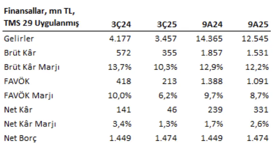 Şirket, 2025 yılının ilk 9 ayında enflasyon muhasebesi uygulanmış verilerle geçen yılın aynı dönemine göre %13 azalışla 12,5 milyar TL ciro elde etmiştir.