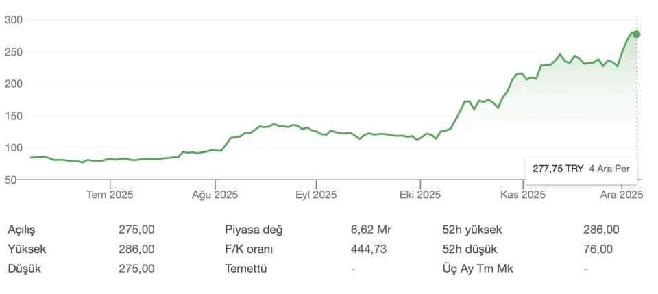 Son 1 yılda %182,84 kazandıran ONCSM hissesi, 4 Aralık 2024 tarihinde 98,20 TL iken bugün 277,75 TL'den işlem görüyor. Yılbaşından beri de %162,03 kazandıran hisse, son 6 ayda ise %228,31 değer kazanımı elde etti. 1 ayda %32,39 değerlenen ONCSM, 5 günde de %17,19 değer kazandı.