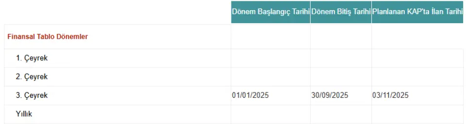 Konuyla ilgili şirketten gelen KAP açıklaması haberin devamında yer almaktadır:"Şirketimizin 01.01.2025 – 30.09.2025 hesap dönemine ilişkin finansal raporlarının 3 Kasım 2025 tarihinde kamuya açıklanması planlanmaktadır.