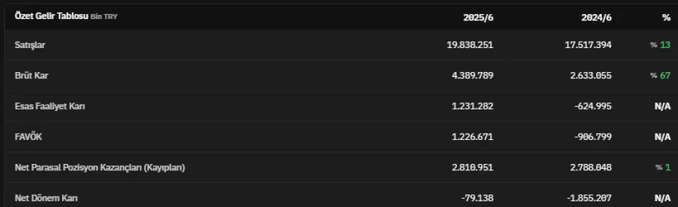 FAVÖK 2025 yılının ikinci çeyreğinde 1.226.671.000 TL olarak açıklanmıştır. Net Parasal Pozisyon Kazançları (Kayıpları) 2025 yılının ikinci çeyreğinde 2.810.951.000 TL olarak açıklanmıştır. Net dönem kârı ise -79.138.000 TL olarak kaydedildi. İlgili veri 2024 yılının ikinci çeyreğinde -1.855.207.000 TL olarak açıklanmıştı