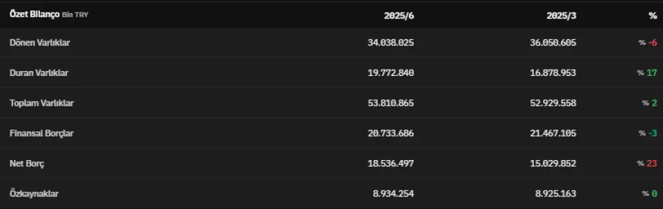 Finansal borçlar 2025 yılının ikinci çeyreğinde 20.733.686.000 TL olarak açıklandı. 2025 yılının ikinci çeyreğinde net borç 18.536.497.000 TL olarak açıklandı. Özkaynaklar 2025 yılının ikinci çeyreğinde 8.934.254.000 TL olarak duyurulmuştur.