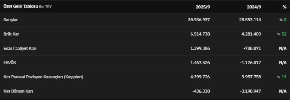 FAVÖK 2025 yılının üçüncü çeyreğinde 1.467.526.000 TL olarak açıklandı. Net parasal pozisyon kazançları 2025 yılının üçüncü çeyreğinde 4.399.726.000 TL olarak kaydedildi. 2024 yılının üçüncü çeyreğinde 3.957.750.000 TL olarak açıklanan net parasal pozisyon kazançları, 2025 yılının üçüncü çeyreğinde %11 artmış oldu. Net dönem kârı ise -436.338.000 TL olarak kaydedildi. İlgili veri 2024 yılının üçüncü çeyreğinde -3.198.947.000 TL olarak açıklanmıştı.