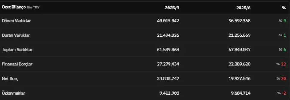 Dönen varlıklar 2025 yılının üçüncü çeyreğinde 40.015.042.000 TL olmuştur. 2025 yılının üçüncü çeyreğinde 21.494.026.000 TL olarak açıklanan duran varlıklar, 2025 yılının ikinci çeyreğinde 21.256.669.000 TL olarak açıklanmıştı. Toplam varlıklar üçüncü çeyrekte 61.509.068.000 TL olarak kaydedildi. 2025 yılının ikinci çeyreğinde 57.849.037.000 TL olan toplam varlıklar, 2025 yılının üçüncü çeyreğinde %6 artmış oldu. Finansal borçlar 2025 yılının üçüncü çeyreğinde 27.279.434.000 TL olarak kaydedildi.