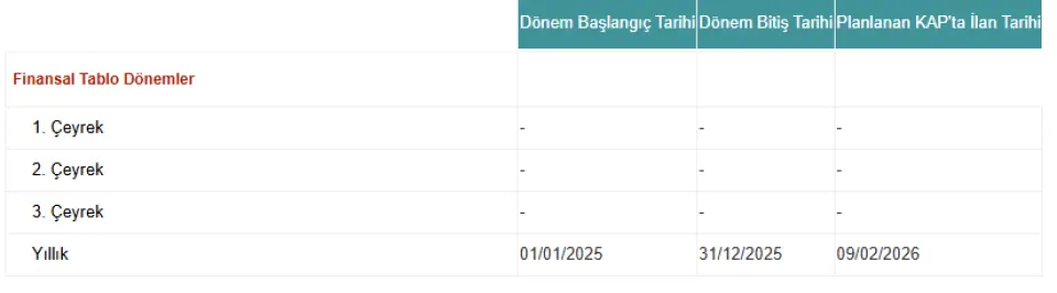 "Şirketimizin 01.01.2025 – 31.12.2025 hesap dönemine ilişkin finansal raporlarının 9 Şubat 2026 tarihinde kamuya açıklanması planlanmaktadır.