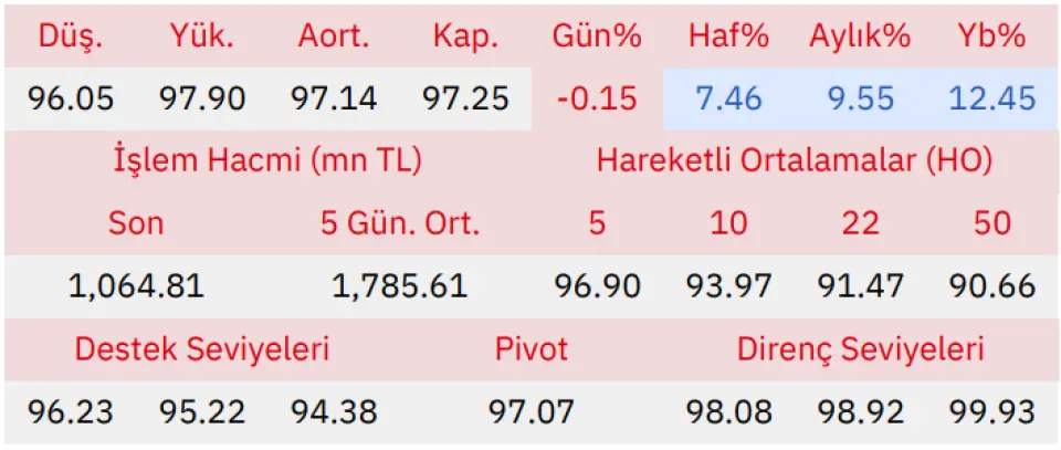 Gün içinde en düşük 96.05 en yüksek 97.90 seviyesini gören Ford Otomotiv Sanayi hissesinin günü %0.15 kayıpla tamamladığı gözlenmektedir. Pivot seviye 97.07 seviyesinden geçmekte olup, aşağı yönlü hareketlerde birinci destek 96.23, ikinci destek ise 95.22 seviyesinden geçmektedir. Dirençler ise sırasıyla 98.08, 98.92 seviyelerinden geçmektedir. Bu aşamada endeksin 5 günlük HO seviyesinin %0.36 üstünde, 22 günlük HO seviyesinin ise %6.31 üstünde hareket ettiği dikkat çekmektedir. Son gün işlem hacmi ise bu aşamada 5 günlük ortalama işlem hacminin % 40.37 altında gerçekleşmiştir.