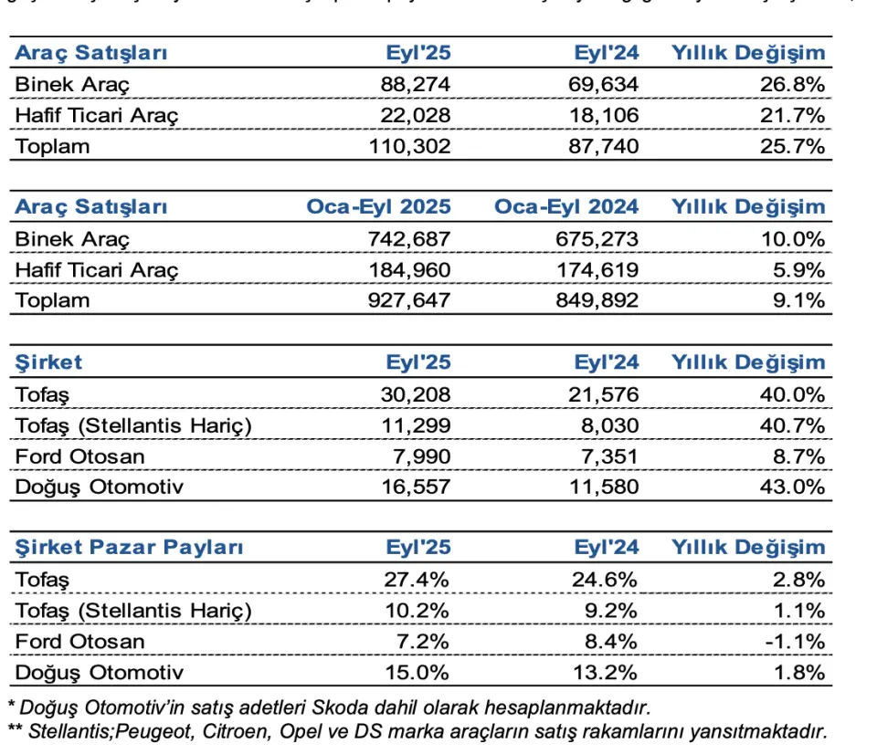 - "Türkiye otomotiv pazarı 2025'in Eylül'ünde önceki senenin aynı dönemine oranla %25,7 artış göstererek 110.302 adet seviyesinde gerçekleşti. Böylece, satışlar Mart'tan beri 100.000 adet seviyesinin üzerindeki seyrine devam ederken, Eylül ayları özelinde de tüm zamanların en yüksek seviyesine ulaşıldı. Eylül ayı döneminde binek araç satışları yıllık bazda %26,8 yükselerek 88.274 adede, hafif ticari araç satışları da %21,7 artışla 22.028 adet seviyesinde gerçekleşti. 2025 yılı Ocak-Ağustos döneminde ise, toplam otomotiv satışlarının %9,1’lik yıllık büyüme ile 927.647 adede ulaştığını görüyoruz. Bu dönemde binek araç segmenti %10,0 artışla 742.687 adede yükselirken, hafif ticari araç segmenti %5,9 yükseliş göstererek 184.960 adet seviyesinde gerçekleşti."