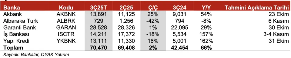 - "Bankaların kar sezonu 23 Ekim 2025 tairihi itibariyle Akbank ile başlayacak ve onu Garanti ve Yapı Kredi takip edecek. Kapsamımızda yer alan bankalar için 3. çeyrekte karların çeyreksel bazda sadece %2, yıllık bazda ise %66 artacağını tahmin ediyoruz. Çekirdek gelirler 3. çeyrekte genişleyen TL kredi/ mevduat makası, Ekim TÜFE beklentilerinin yukarı revizyonu ve üye işyeri komisyonlarındaki artış sayesinde çeyreksel bazda %25 artabilir."