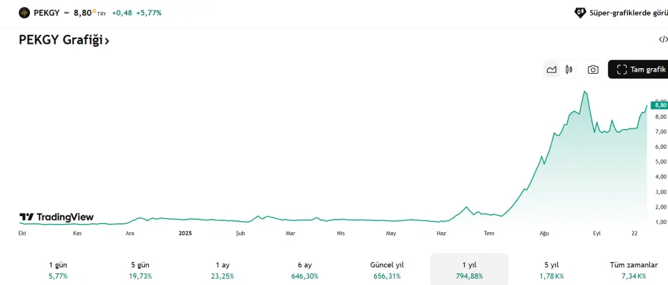 Peker GYO geçtiğimiz günlerde yükseliş trendine giren şirketler arasında yer almayı başardı. Şirketin yaptığı bu hareketle birlikte son 1 yılda %800 oranında kazanç sağlandı. Yatırımcı açısından bakıldığında bu yükseliş paraların nerdeyse 9 katına çıkması anlamına geldi.