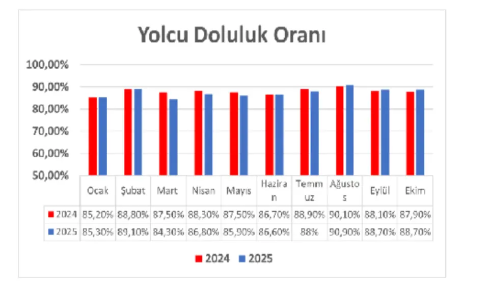 Ekim ayının da geride kalmasıyla Ocak- Ekim döneminde toplam yolcu büyümesi yıllık %15'e ulaşırken, yolcu sayısı 36 milyon oldu. Şirket bu rakamın yıl sonunda 40 milyonu aşmasını bekliyor. Doluluk oranı ise geçen yılın aynı dönemine göre 0,5 puan azalışla % 87,5 olarak gerçekleşti. Dış hat yolcu büyümesi ilk 10 ayda %18 artışla öne çıkarken, iç hatlar %10 artış gösterdi. Dış hat yolcu sayısı, toplam yolcunun %63,3'üne ulaştı.