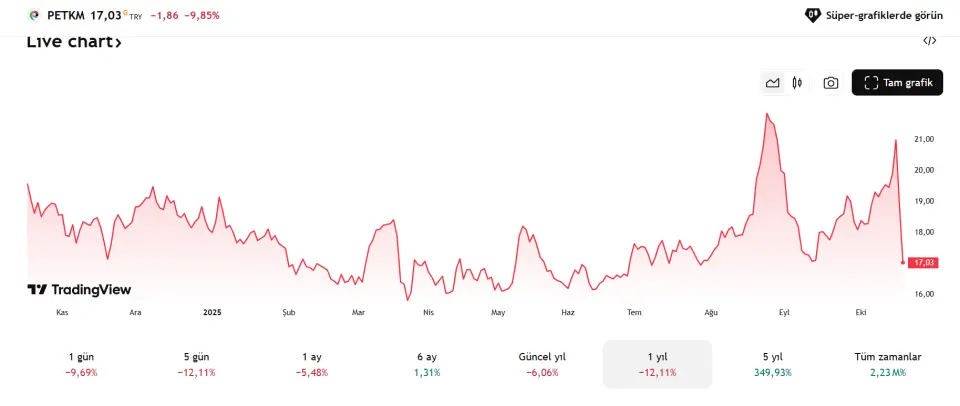 Orta ve kısa vadede hissede ciddi bir durgunluk göze çarpıyo. Petkim son bir yıl içinde %12 civarında değer kaybederek yatırımcılarının beklentisinin altında kaldı. Üstelik sadece uzun vadede değil, son 5 günde de benzer bir kayıp yaşandı. Bu da haliyle yatırımcıların moralini epey bozdu. Bugün itibariyle hisse %10 civarında değer kaybedip 17 TL seviyesine kadar indi. Bu hareketle birlikte yatırımcılar “Acaba bu düşüş daha ne kadar sürecek?” diye sormaya başladılar.