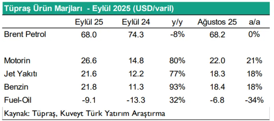 Tüpraş, Eylül ayına ilişkin ürün marjlarını açıkladı. Orta distilat ürün grubunda motorin marjı aylık bazda %21 artışla 26,6 dolar, jet yakıtı marjı ise %18 artışla 21,6 dolar seviyesinde gerçekleşti. Diğer yandan benzin marjları %18 artışla 21,8 dolar seviyesinde kaydedilirken fuel oil marjları %34 gerileme ile -9.1 dolar olarak açıklandı.