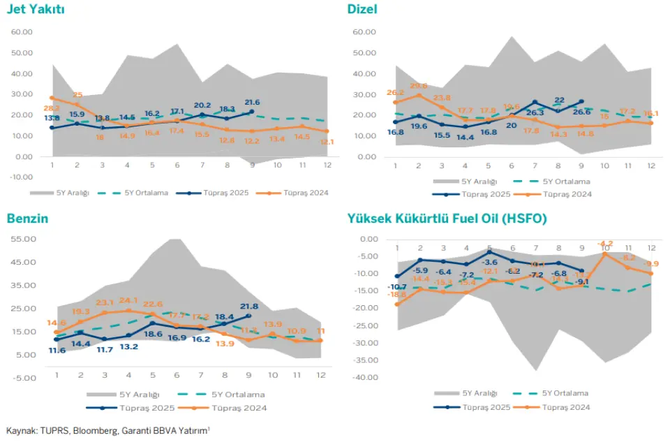 Tüpraş'ın Eylül ayı ortalama ürün marjları geçtiğimiz yılın aynı döneminin %113 üzerinde gerçekleşti. Jet yakıtı marjları 9.4$ (+%77), dizel marjları 11.8$ (+%79.7), benzin marjları ise 10.5$’lık (+%92.9) artış gösterdi. Fuel oil marjlarında da 4.2$ (%31.6) iyileşme görüldü. 2025 Ağustos ayı ile kıyaslandığında da jet yakıtı marjlarında %18, dizel marjlarında %20.9, benzin marjlarında ise %18.5 artış izlendi.