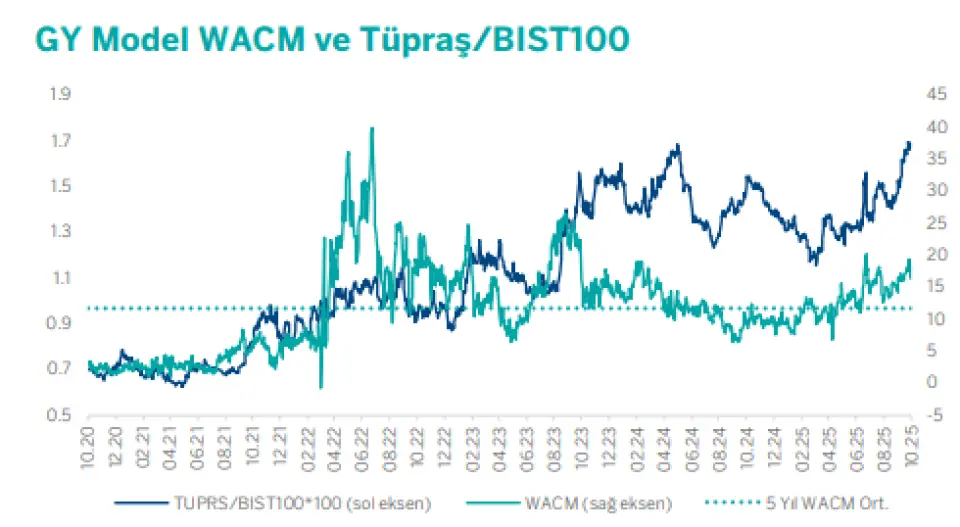 2025’in Ağustos ayında 14.6$ tahmin ettiğimiz WACM’ın Eylül ayında 2.3$ (%15) yükselişle 16.9$ gerçekleştiğini, böylelikle 2024’ün aynı dönemine (7.9$) kıyasla %113 arttığını hesaplıyoruz. Tüpraş 2025 yıl sonu için 5-6$ bölgesinde net rafineri marjı (NRM) projeksiyonu açıklamış, 2025’in ilk çeyreğini 4.1$, ikinci çeyreğini ise 5.3$ NRM ile geride bırakmıştı. NRM hedefinin bu çeyrekte 3$ kadar aşılabileceğini hesaplıyoruz.